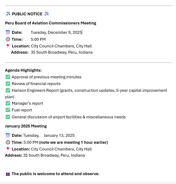 Peru Municipal Airport Board Meeting Zoom link